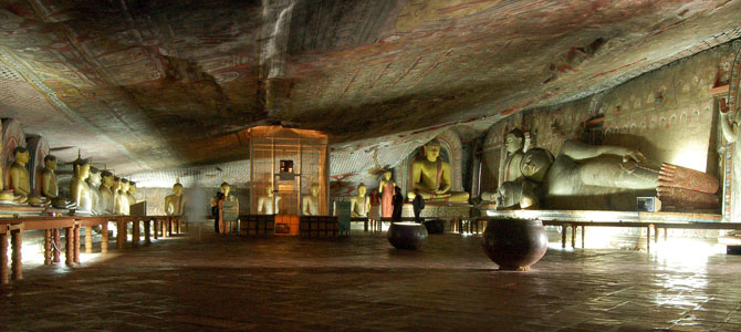 The largest and most impressive of the caves, the Temple of the Great King, is 52 metres from one side to another, and 23 metres from the entrance to the back, with the sloping ceiling seven metres at its highest point. The entire surface of the cave is a mosaic of frescoes with so many themes and styles that it is easy to be overwhelmed.The paintings at Dambulla are representative of many different epochs of Sinhalese Buddhist art, although the classical school of Sinhalese painting (which ceased at the end of the 12th century) is not represented. The so-called New School supposedly influenced by the contemporary South Indian Deccan School — is less successful than the earlier indigenous art forms, using brilliant colour schemes with red and yellow predominating. It is not possible to date the Dambulla paintings precisely, since they have been over-painted throughout the centuries. Some, however, were originally done by Kandyan artists during the 17th century.