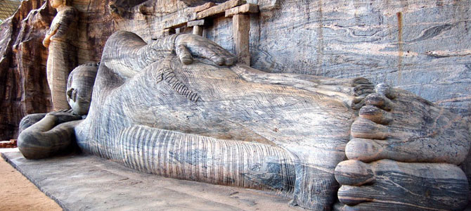 The remains of Polonnaruwa are so numerous that only a few highlights can be mentioned. One of the most striking of the many sites is Polonnaruwa’s Gal Vihara or Rock Shrine, the reclining Lord Buddha is near another statue showing him seated in deep meditation, his throne adorned with lions and thunderbolts. A second seated Lord Buddha, surrounded by other deities including Brahma and Vishnu, is set within a cave cut into the rock face that still bears traces of the frescoes which once decorated the walls. The fourth Gal Vihara statue departs from the conventional poses by depicting the Lord Buddha as a seven-metre tall standing figure with arms crossed.